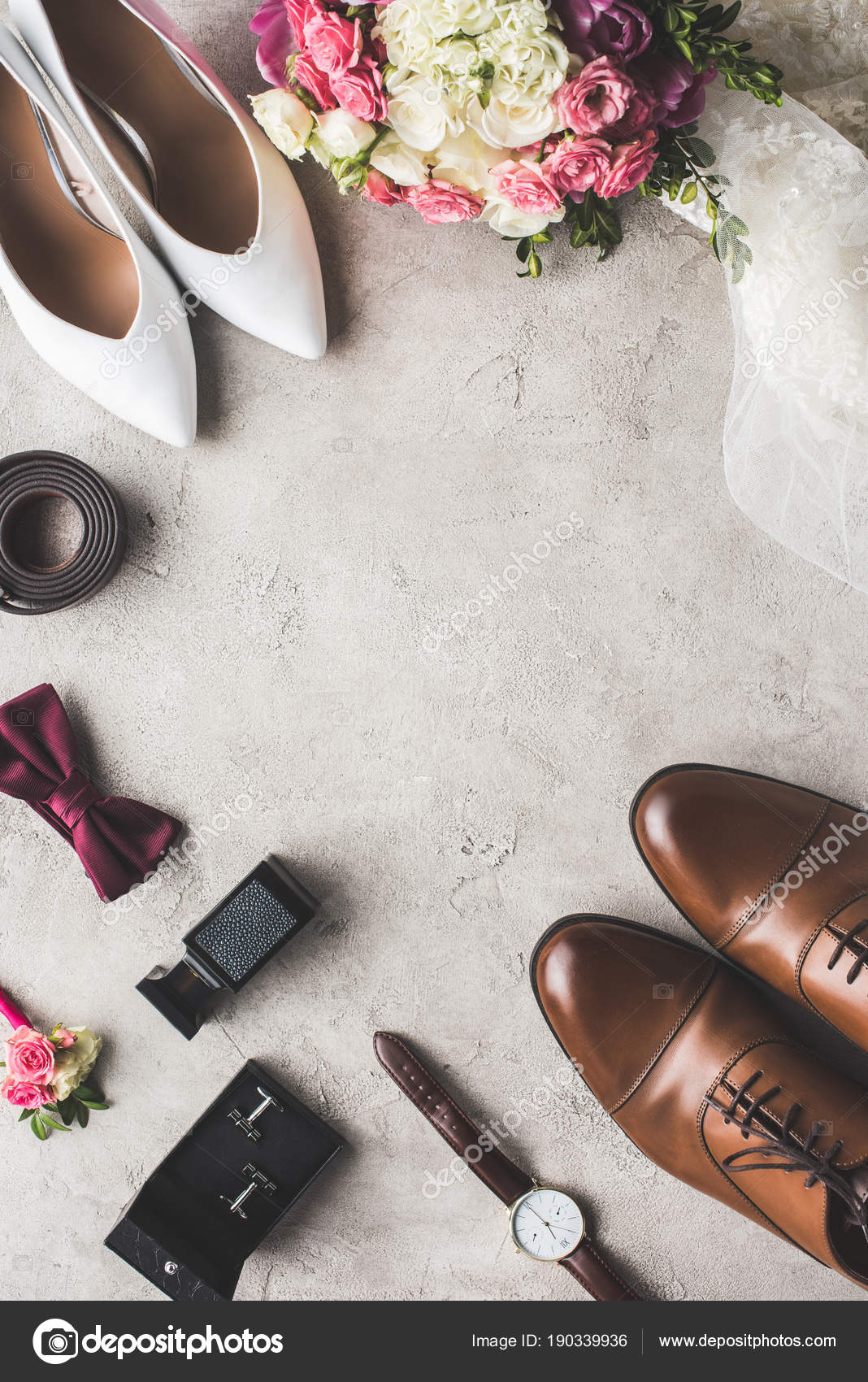 Bovenaanzicht Van Bruiloft Accessoires Grijs Tafelblad Stockfoto