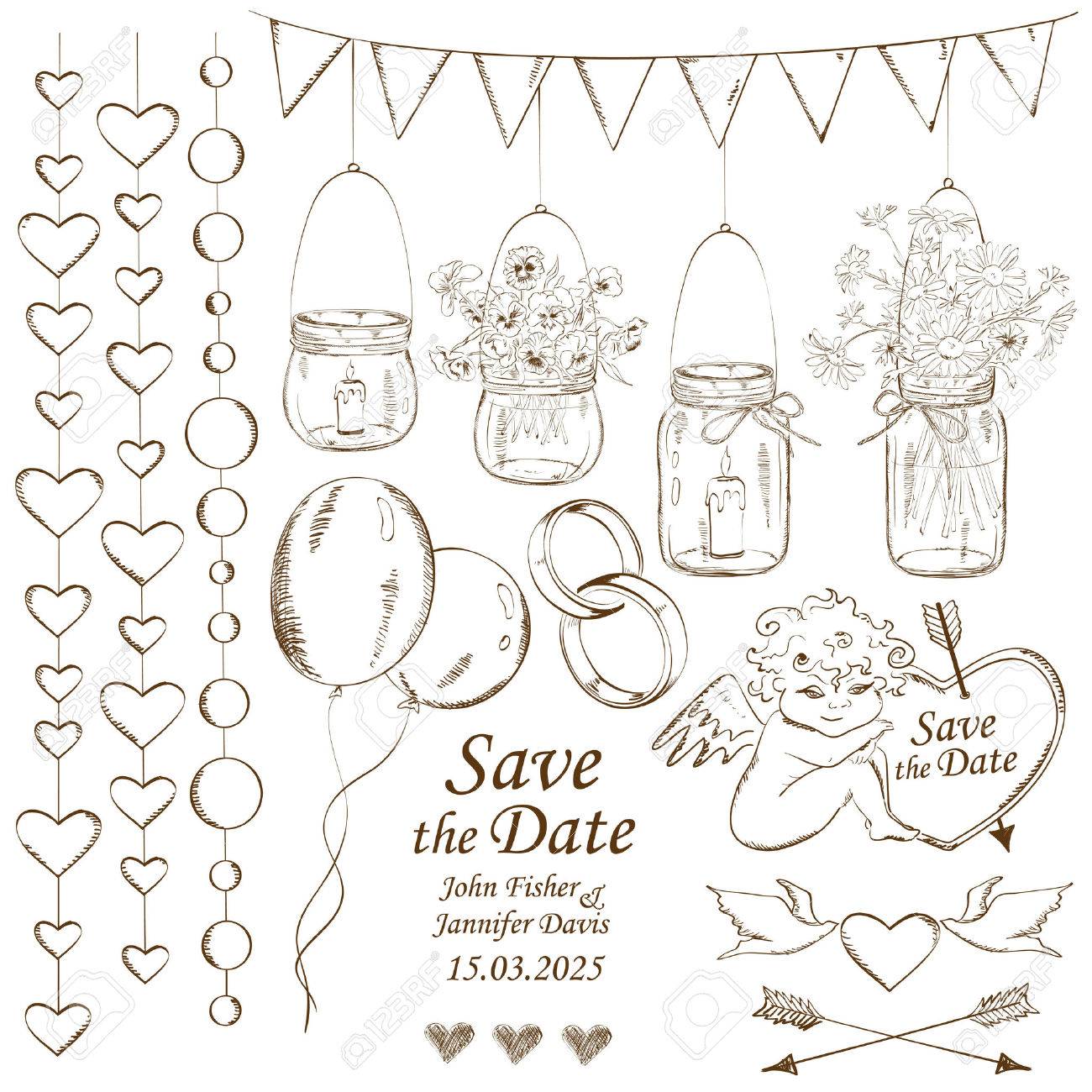 Set Van Geisoleerde Schets Bruiloft Decoratie Elementen Royalty