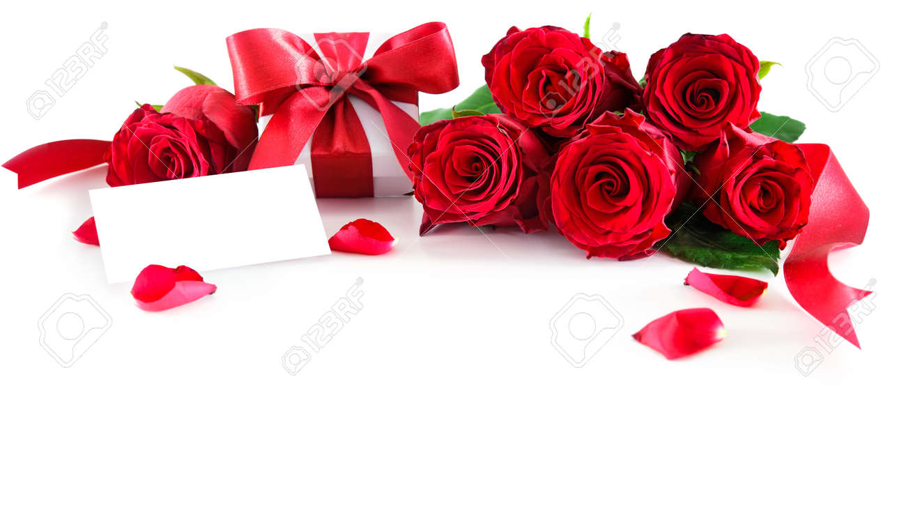 Boeket Van Rode Rozen En Geschenkdoos Met Lege Tag Geisoleerd Op