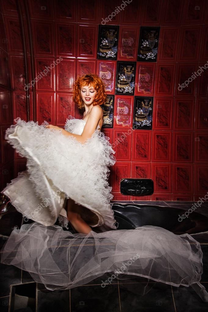 Dansende Vrouw In Witte Bruiloft Jurk Badkamer Stockfoto